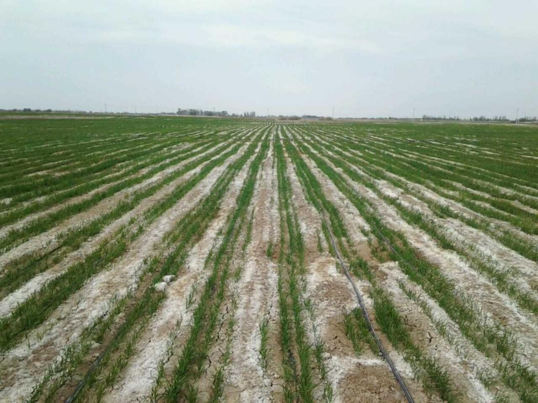 對(duì)于中度、輕度鹽堿地,不需要大水漫灌,采用滴灌設(shè)備,直接采用干播濕出方式,滴水出苗時(shí)加入禾康土壤調(diào)理劑,苗期繼續(xù)加入禾康土壤調(diào)理劑深化改良,同時(shí)避免小麥苗受到鹽堿傷害,可以大大節(jié)約鹽堿地開(kāi)發(fā)投資,同時(shí)明顯縮短鹽堿改良時(shí)間。(只適合新疆北疆,南疆極重度鹽堿荒地不適合這種模式,改良后成中輕度鹽堿也可以采用這種改良模式。)