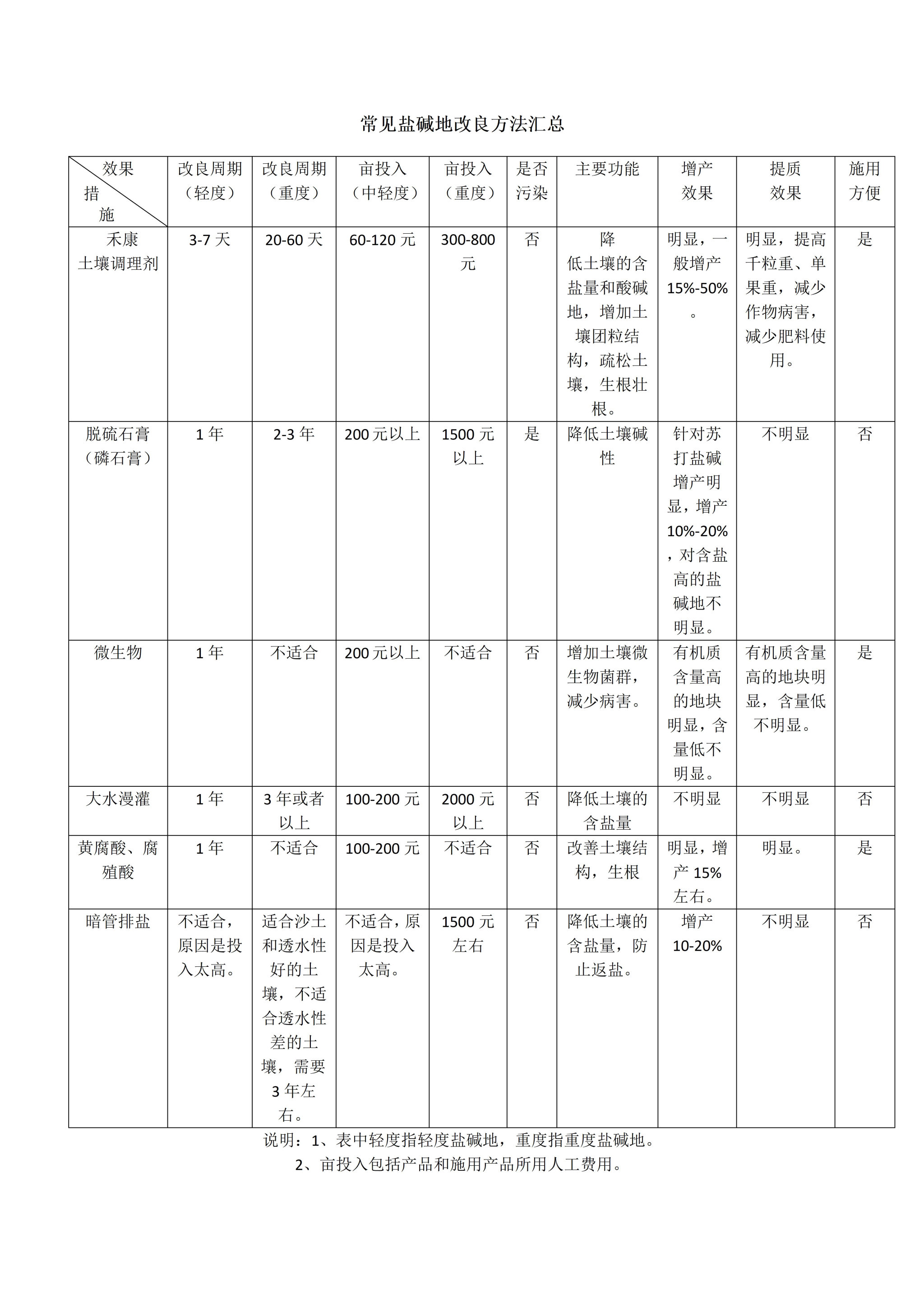 ? ? 隨便上網(wǎng)“百度”一下,就可以找出很多鹽堿地改良方法,也可以找出很多用于鹽堿地改良的產(chǎn)品。有的朋友跟我反饋說他花了很長時間上網(wǎng)查資料,學(xué)習(xí)鹽堿地改良知識,但最終還是很難找出適合他的鹽堿地改良方案。筆者專注鹽堿地改良二十二年,我認(rèn)為用戶在選擇鹽堿地改良產(chǎn)品或者鹽堿地改良方案的時候,應(yīng)該從下面幾個角度來考慮;第一就是鹽堿地改良周期,如果鹽堿地改良周期在兩年或者更長,就不要考慮,因為農(nóng)業(yè)本身不是高利潤行業(yè),改良周期長意味著收回投資期就長,這無疑加大了投資風(fēng)險;第二要考慮鹽堿地改良投入,如果受鹽堿危害的中低產(chǎn)田改良投入每畝超過300元,重度鹽堿地改良投入每畝超過1000元一般不要考慮,除非遇到不得不上工程措施的情況;第三要考慮實際改良效果。對于用戶來說,評價鹽堿地改良成功與否的標(biāo)準(zhǔn)應(yīng)該包含兩個方面,一個是土壤指標(biāo)的變化,一個是產(chǎn)量的多少,只有土壤理化指標(biāo)的改善,當(dāng)年沒有一定產(chǎn)量的形成,對很多用戶是沒有多少意義的,因為很多用戶無法承受巨額虧損,比如一畝地虧800元,種植1000畝地就要虧損800,000元,這對很多種植戶都是無法承受之重,因此改良鹽堿地就既要考慮土壤理化指標(biāo)改善的情況,還要考慮當(dāng)年有一定的收成,可以大大減少當(dāng)年的虧損;第四要考慮環(huán)保,因為鹽堿地幾乎都是沒有被污染的處女地,用沒有污染的辦法改良,經(jīng)過三年左右的轉(zhuǎn)化,可以有機(jī)會從事有機(jī)農(nóng)業(yè)生產(chǎn),這樣改良鹽堿地才更有未來;第五要考慮方便性和實用性。很多鹽堿地改良措施實施起來很不方便,需要大量的人工,還有的地方嚴(yán)格限制灌溉水用量,再用大水漫灌沖洗顯然不行。為了方便大家選擇,我做了一個表格,希望對你們在選擇鹽堿地改良方法時有幫助。